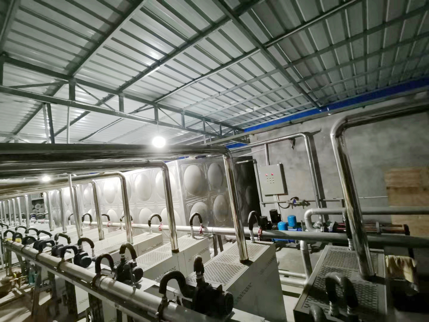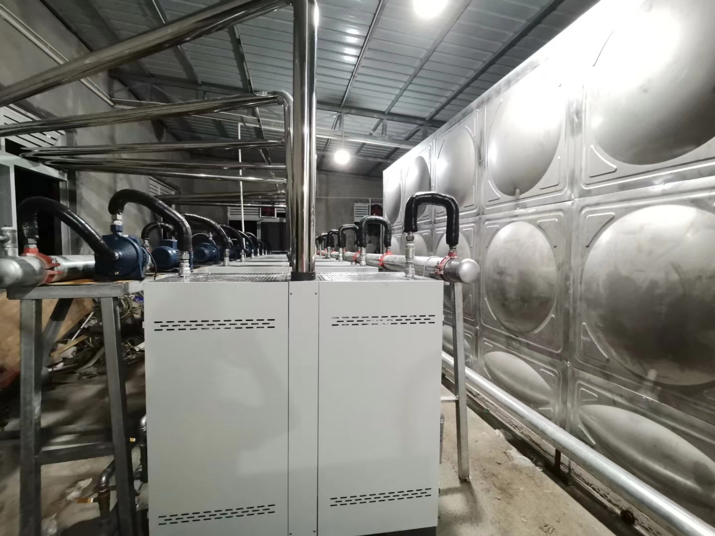 改造后采用18臺常壓熱水機,配合一120噸的水箱提供全校5000師生熱水。
