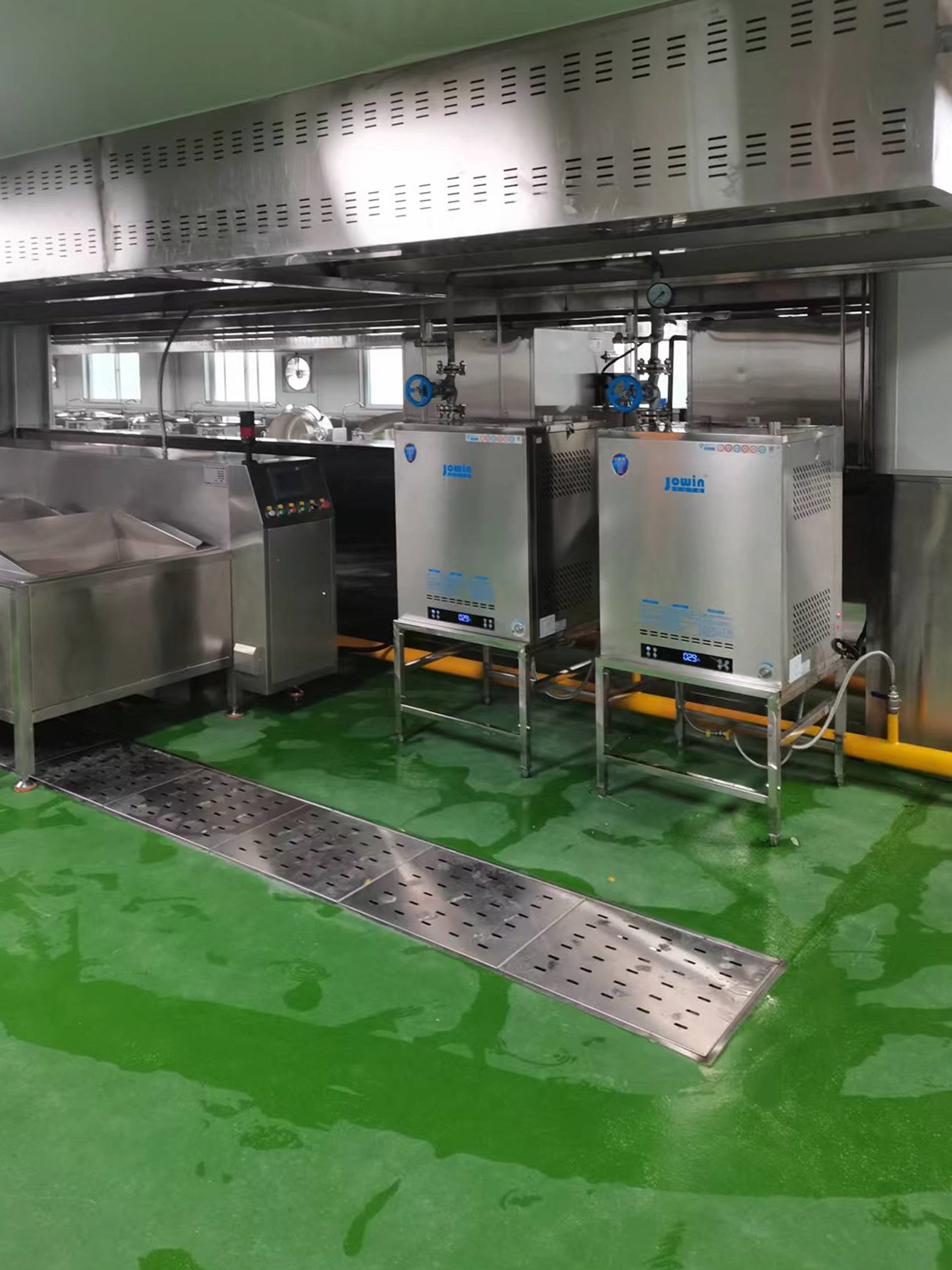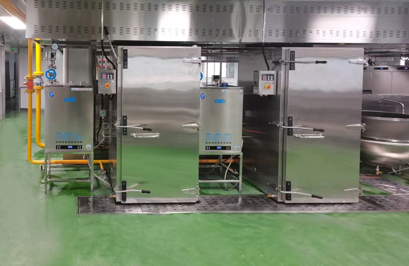 漢中中央廚房項目,卓益蒸汽發(fā)生器配的洗筐機,蒸箱和瓢湯線